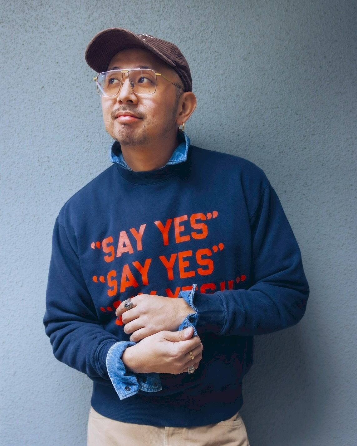 メンバー黒野のYouTubeの撮影中にSwellの店頭にあった1枚が元ネタとなったスウェットです